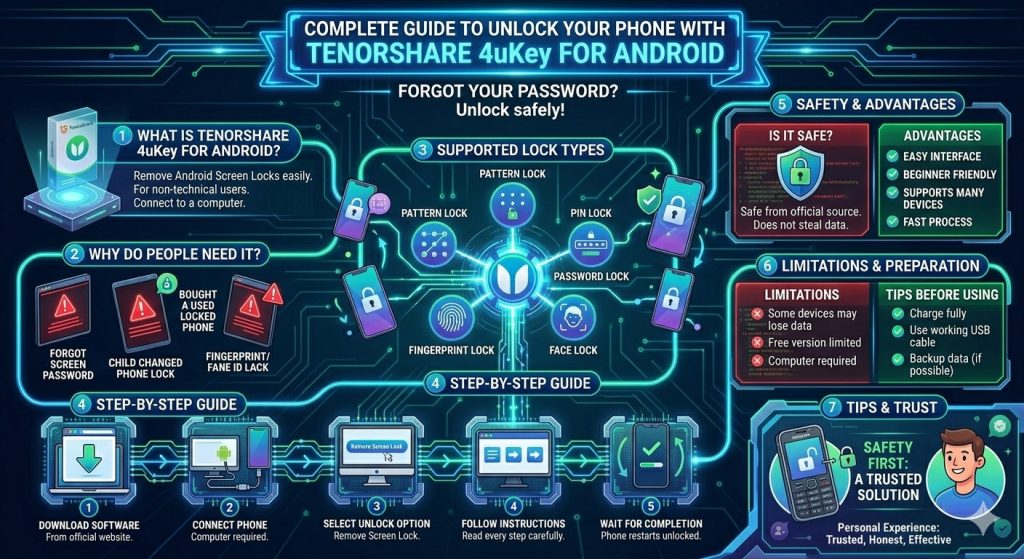I think if you are reading this guide then you also want a safe and simple way to unlock your android phone. In this article we will cover everything about Tenorshare 4ukey for android. We will discuss how it works, who should use it when it is safe and what you should expect. I will also share my personal experience using it.